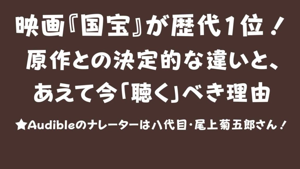 映画『国宝』実写邦画歴代1位の快挙!2時間の映像だけでは描けない「衝撃の真実」を紹介。映画と原作の決定的な違い、歌舞伎を知らない人こそ聞くAudibleで聴くべき3つの理由を解説!ナレーターは八代目・尾上菊五郎さん!【訃報】片岡亀蔵さん急逝の詳細と経歴の全貌!ご家族や妻中村明美さんのことなどまとめ【動画解説付き】