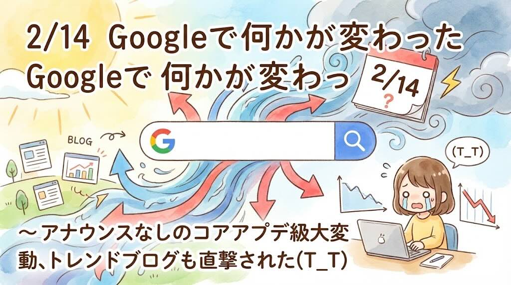 2月14日以降、Googleでアナウンスなしのコアアプデ級大変動が発生 。筆者のトレンドブログもPVと単価が下がり、収益が約20%減少しました 。4位以下の順位が不安定な現状と、今後の対策についてまとめています 。高市カタログギフト問題を野党が追及?文春砲で踊る国会の茶番を整理する!
