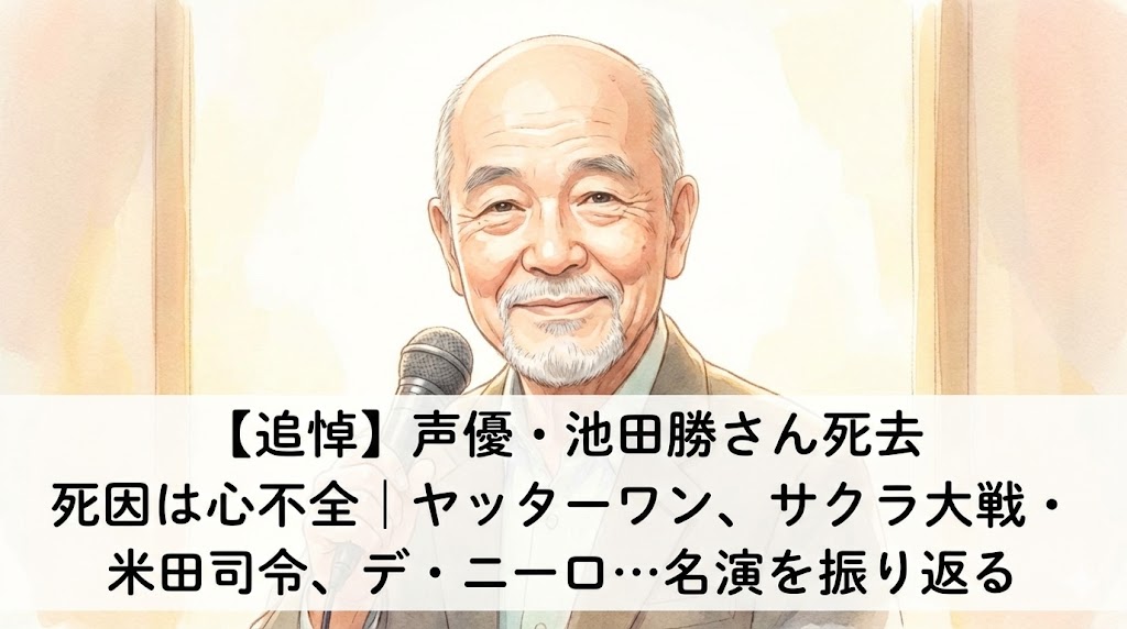 【追悼】声優・池田勝さんが83歳で死去。死因は心不全。『ヤッターマン』ヤッターワン、『サクラ大戦』米田司令、洋画ではデ・ニーロやモーガン・フリーマンの吹き替えで活躍。名優の経歴と愛された名演を振り返ります。【中道改革連合】結成時入党した元立憲民主党議員の当落一覧などまとめ