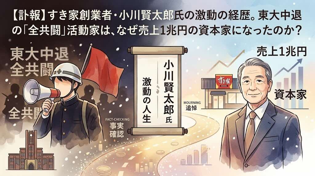 年寄株の基礎知識から2025年最新版の所有者一覧、貸借状況、取得条件、名跡の変遷まで詳しく解説。相撲制度の全体像が見える!【訃報】すき家創業者・小川賢太郎氏の激動の経歴。東大中退の「全共闘」活動家は、なぜ売上1兆円の資本家になったのか?
