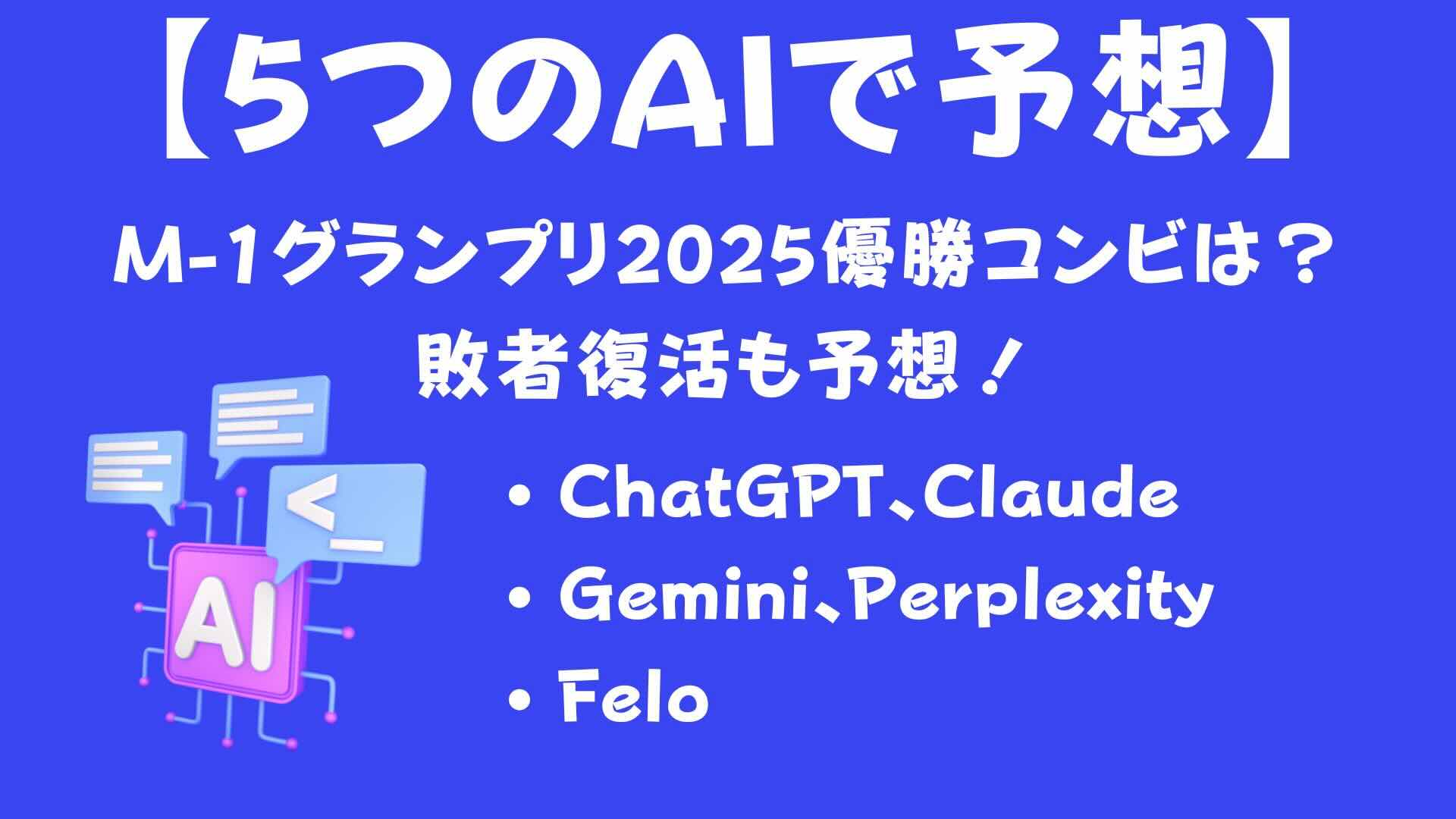 最近、いろいろなAIを使う機会が増えました。そこで、普段よく使っている5つのAIで「M-1グランプリ2025優勝コンビ予想」をしてみました。