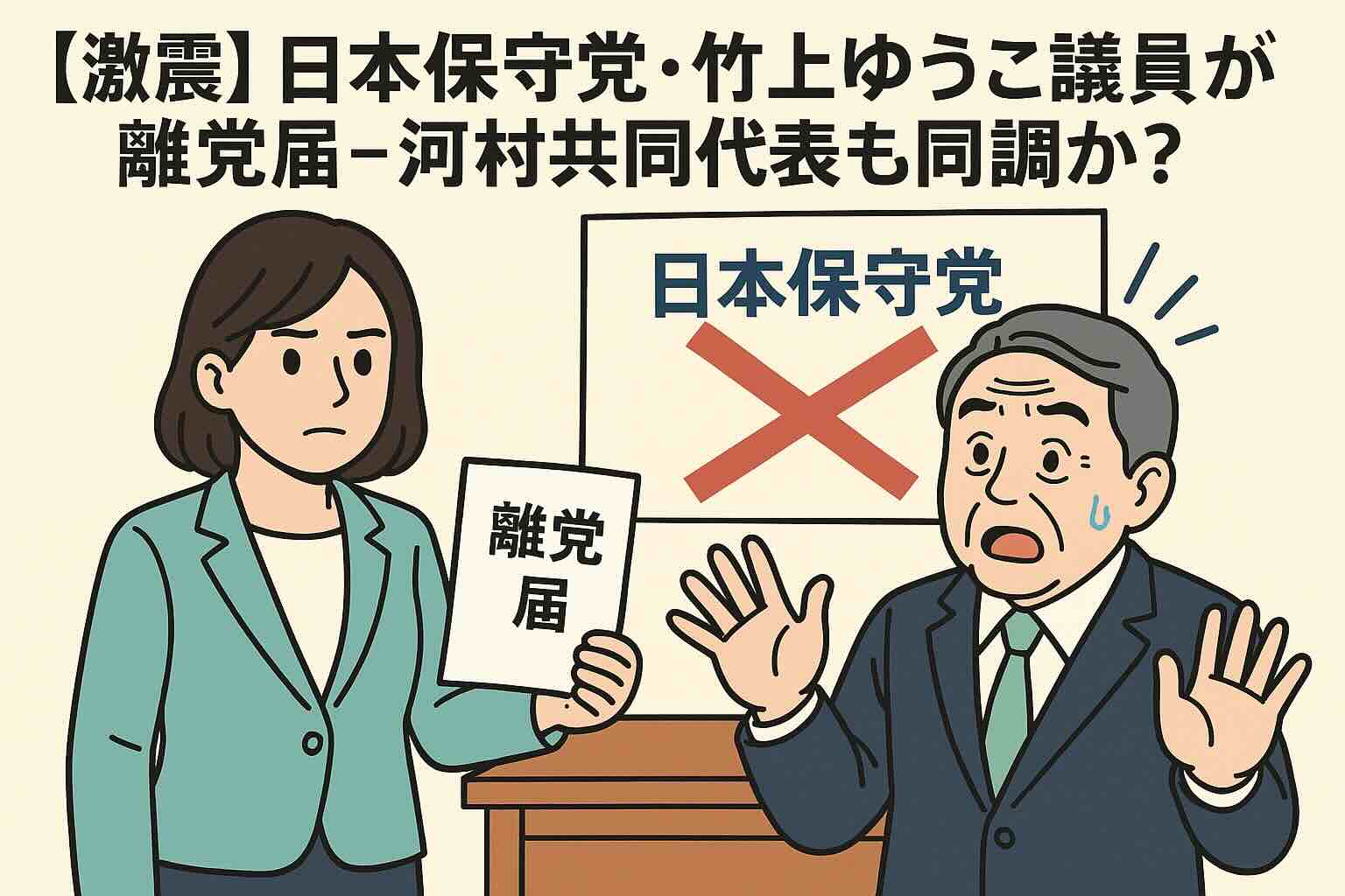 日本保守党で竹上裕子議員が離党届提出、河村共同代表も離党を示唆。党の行方と支持者が取るべき対応を解説する最新まとめ。 -