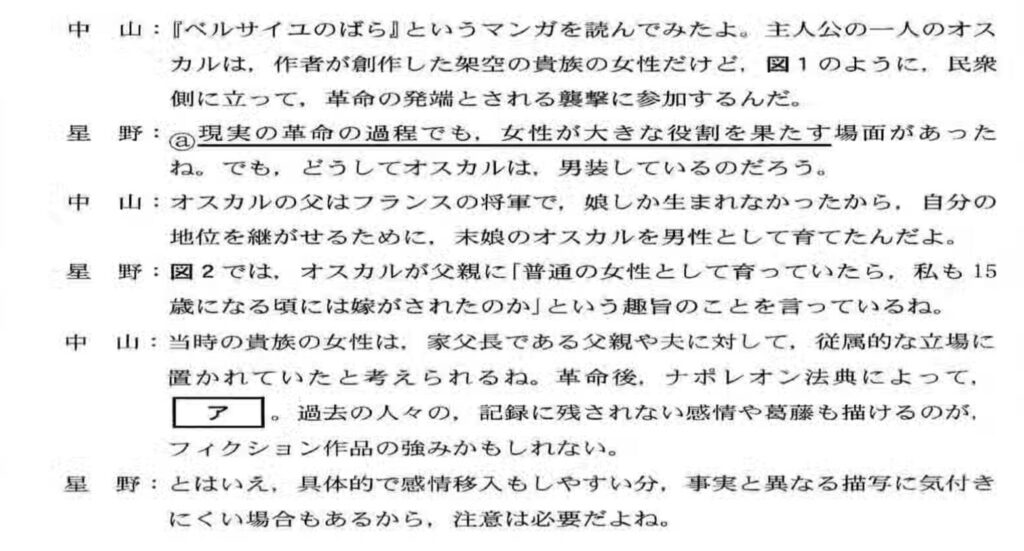 男装の麗人であるオスカルの苦悩を通して、革命当時の家父長制や女性の権利について考えさせる設問構成になっていました。18世紀フランスでは、女性は政治参加を認められず、財産権も制限されていました。オスカルというキャラクターは、そうした制約に抗う存在として描かれています。