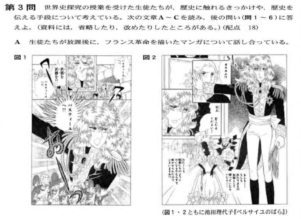 その大問の中で、フランス革命期を扱う資料として、池田理代子先生の『ベルサイユのばら』のコマが引用されました。教科書の肖像画や風刺画と並んで、少女漫画のキラキラした瞳のオスカルが印刷されている光景は、あまりにシュールで衝撃的でした。