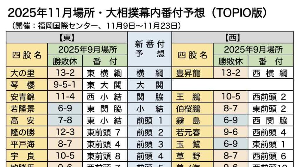 9月場所終了時点で、筆者 TOPIOが予想した幕内番付は、次の記事に載せています。