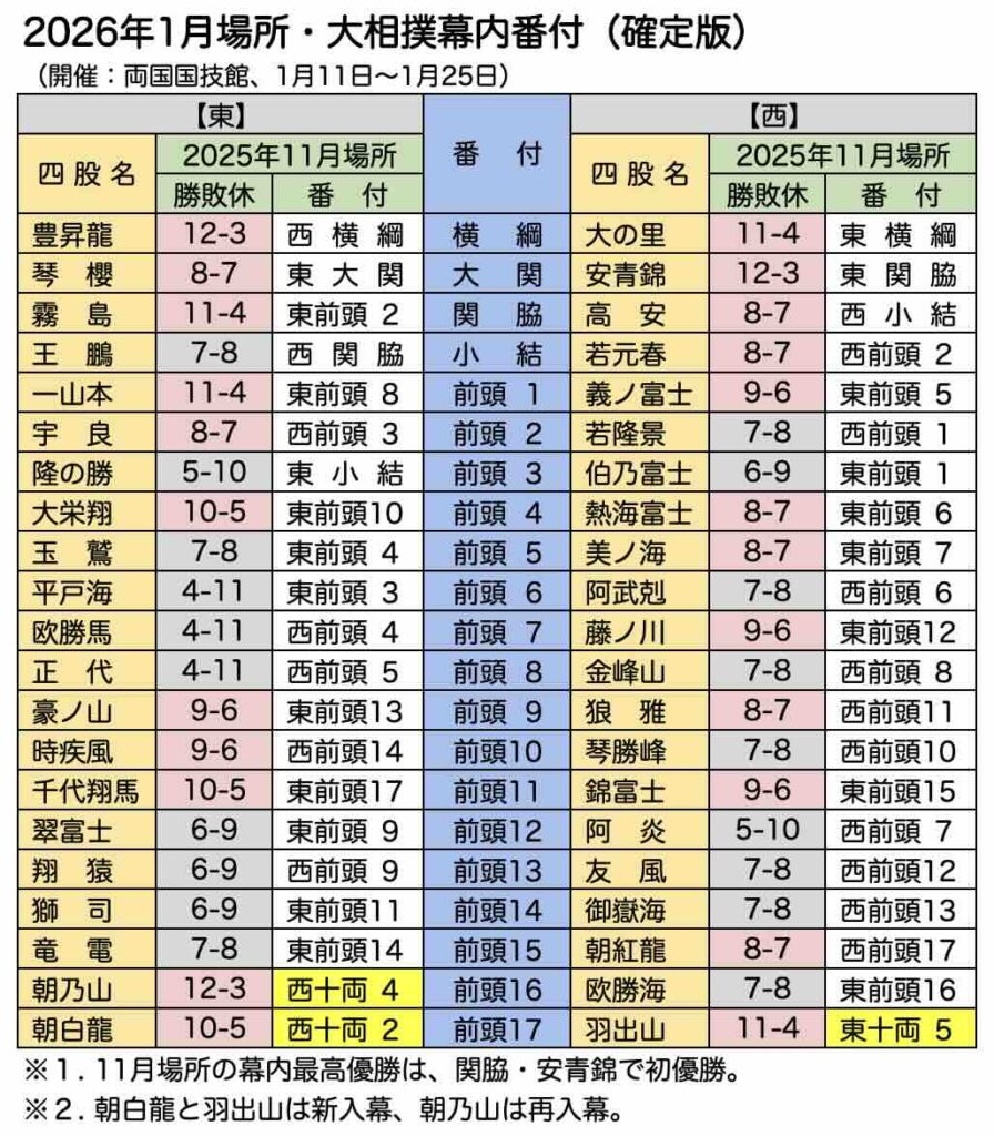 12月22日に発表された2026年1月場所の番付は次の通りです。